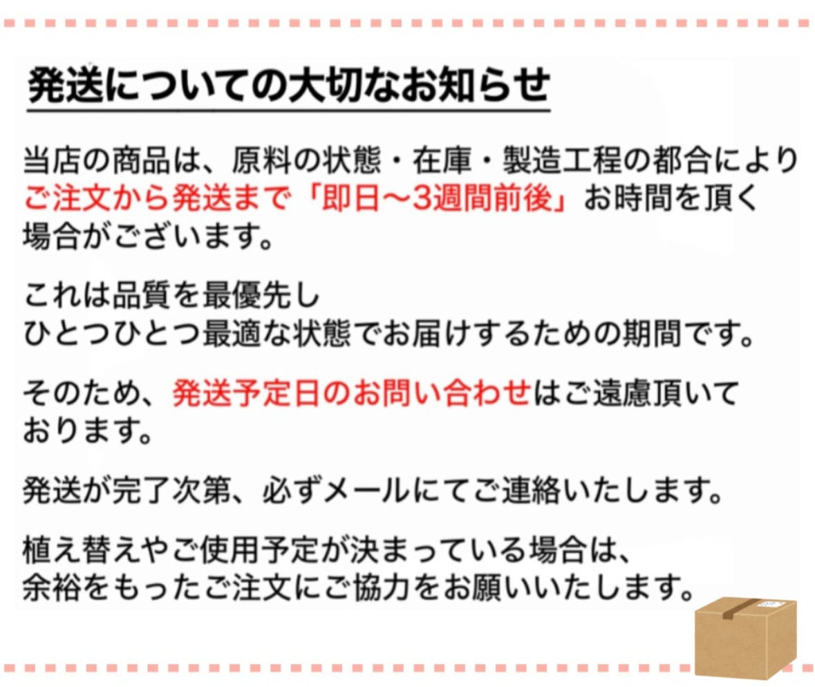『6L』 植物と一緒に育てる土 "オールド" ※オプションにて"必ず" 「室内用」「屋外用」 いずれかをご選択下さい 【室内用】 出来る限り虫が発生しないよう 配慮してお届けいたします その中で植物に必要な微量要素・中量要素を含めた ミネラル各種は最大限に活かす配合にしています 【屋外用】 室内用培養土の配合にプラスして 堆肥成分を数種類ブレンドします その為、土の栄養面は室内用を上回りますが 虫やキノコが発生する可能性があります 外園芸を楽しむ場合にご選択ください 【土の特徴】 植物と一緒に育てる土 オールドには 熟成された数種類のヤシガラと 植物に必要な数種類の微量要素・中量要素を含めた ミネラル各種を厳選して配合しています また、土壌中の"団粒化"を促進させる 資材も混ぜ込むことで 「微生物の活性化」が進み土をフカフカにさせ 月日が経っても植物の成長と共に 土を育てることに特化させた培養土です 【オールドを使うことで期待出来る植物の変化】 ⚪︎即効性のある葉の展開 ⚪︎株の充実度UP ⚪︎根張りの向上 ⚪︎根腐れの軽減 ⚪︎生育不良の改善 大小の土の粒を組み合わせることで 土内で緩急を生じさせ 生育を向上させる 土壌環境にしています 発送前に 「ミネラル成分」「元肥」 オプションをご希望の場合は 「テラチップ®︎」を 配合してお届けします ご不明な点や心配な点がございましたら お問合せくださいませ