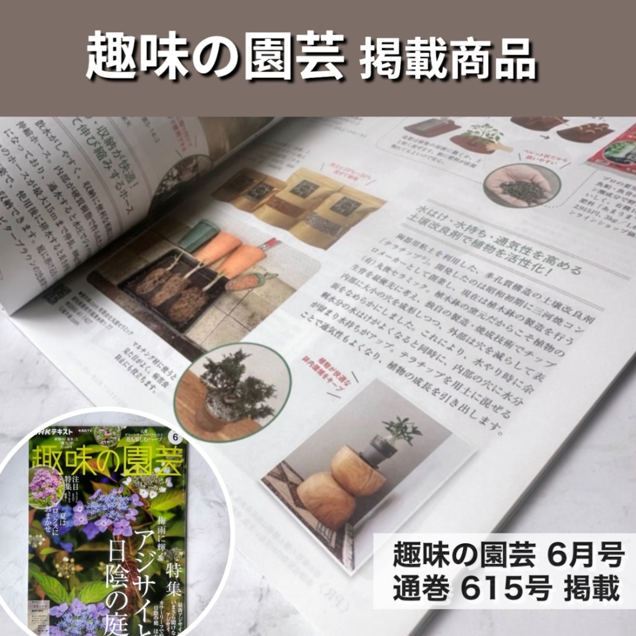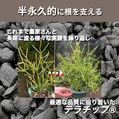 用土にテラチップを混ぜる事により、用土内に気層を確保し弱酸性に傾いた土でも、多くの植物の育成に適した弱酸性〜中性に近づける事ができ、植物の根の成長を促します。