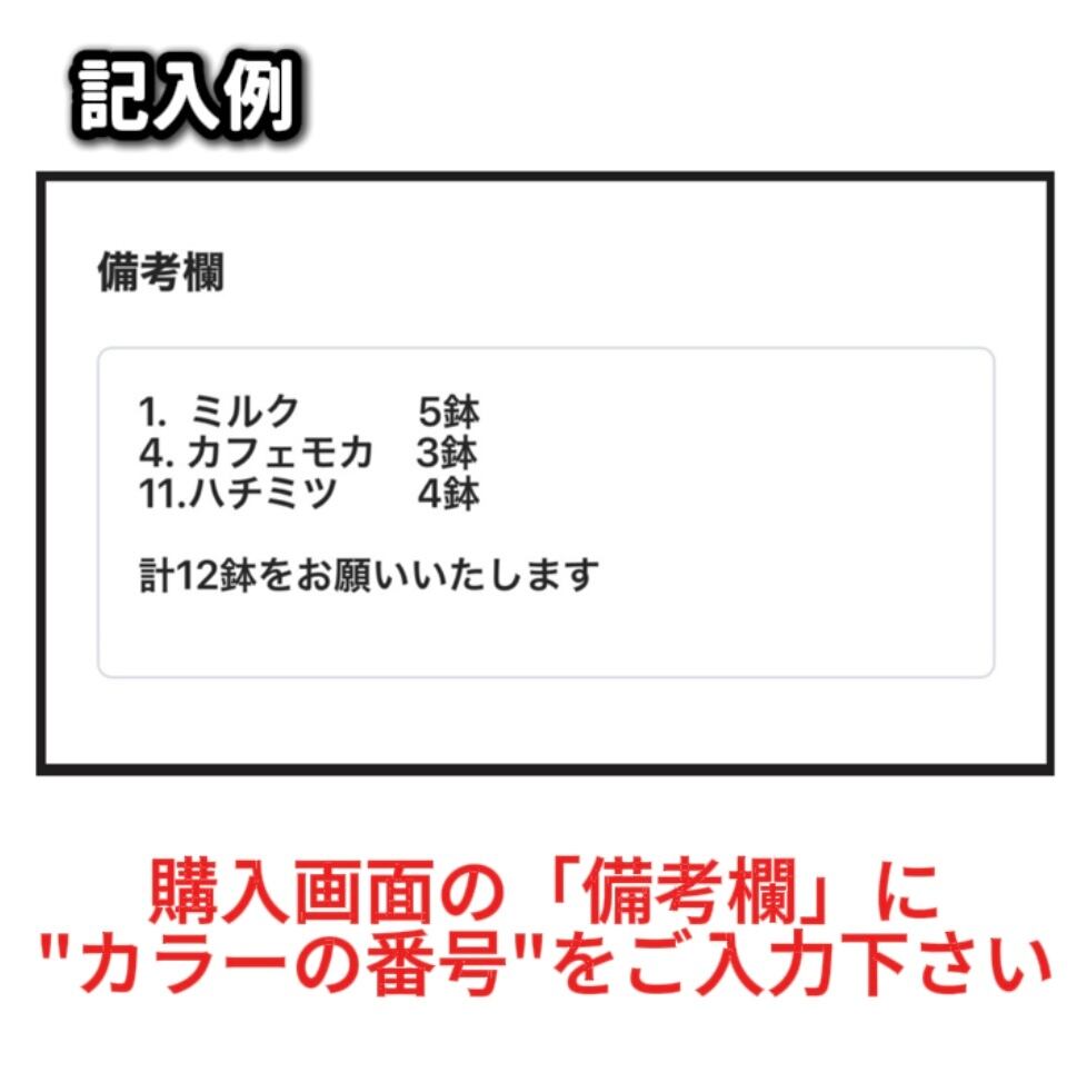 カートに追加後「備考欄」にお好みの"カラー番号"を3色分入力